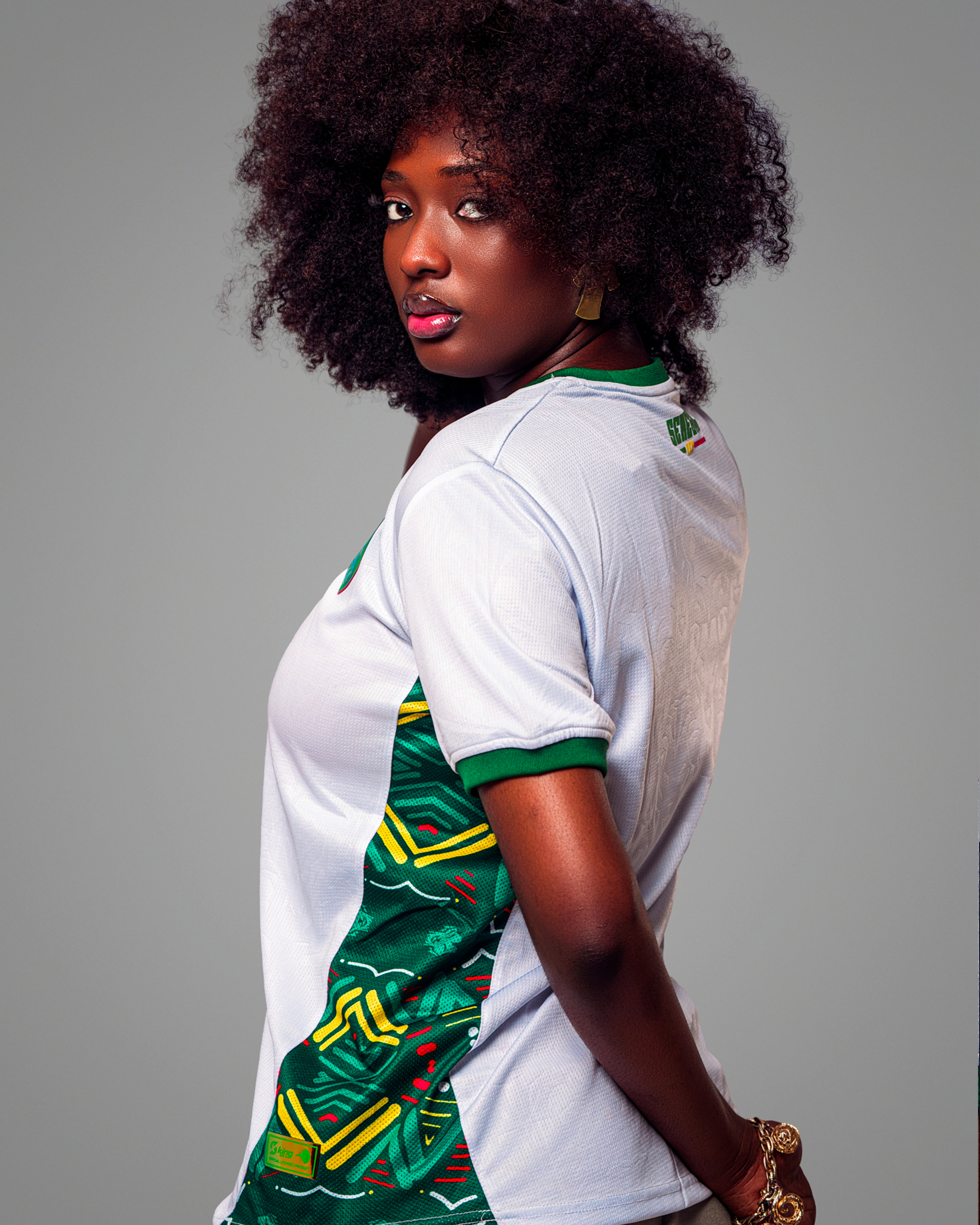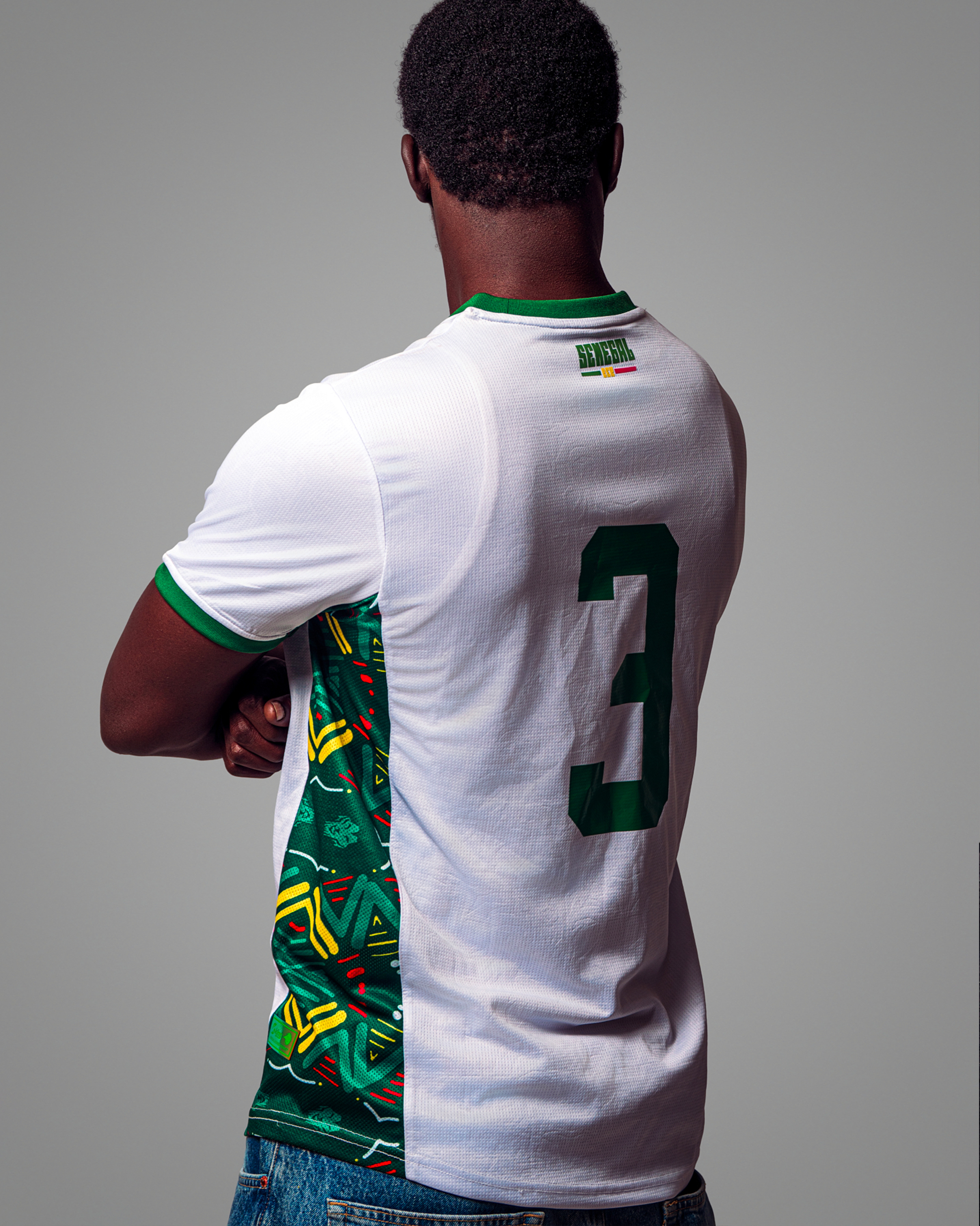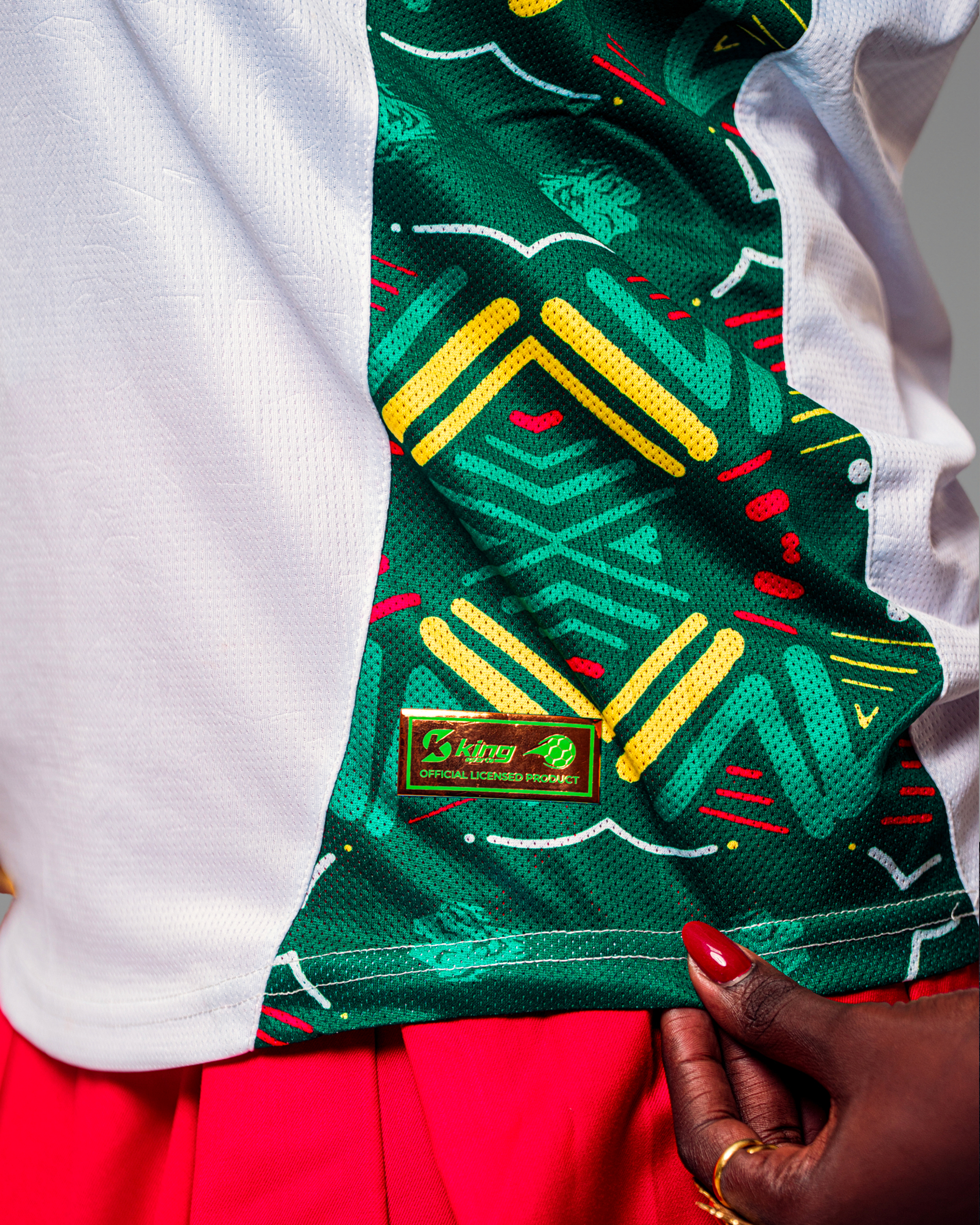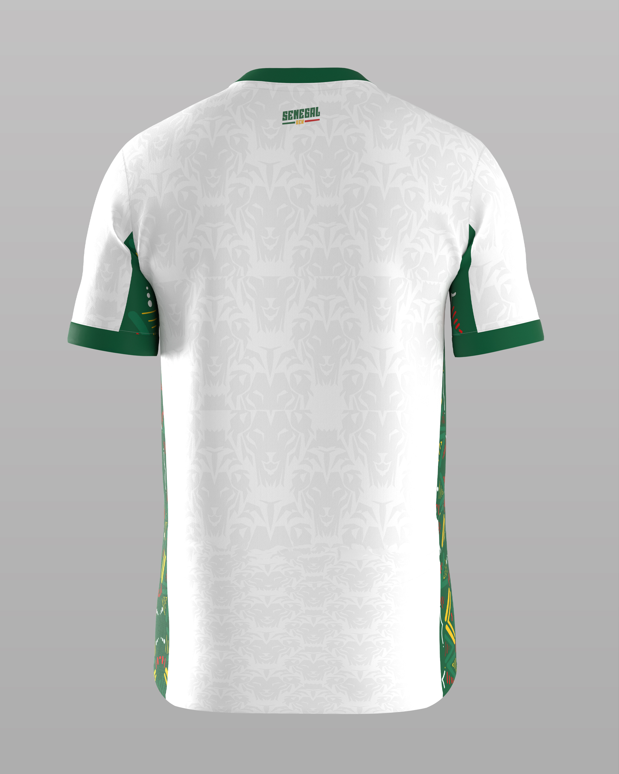 | Détails | Manches courtes avec bordures vertes. Le panneau latéral gauche se distingue par le même motif coloré (vert, jaune, rouge) et dynamique que le maillot vert, créant un contraste visuel puissant. |